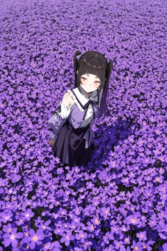 (embedding:IllusP0s:1.3), brat_\(brabrabrat00\), simao (x x36131422):0.5,masterpiece, best quality, newest, absurdres, highres, aesthetic, very aesthetic,  intricate, 1girl, uneven twintails, arched bangs, black hair, orange color eyes, purple theme, outdoors, flower field, upper body, from above, wide shot,