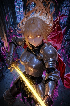 stu dts:0.5,arsenixc:0.5,shixuexiao:0.5,eufoniuz:0.5,from above, scenery,1girl, solo focus, detailed background, high contrast, solo, large breasts, long hair, floating hair, female knight, ornate armor, black collar, pauldrons, breastplate, corset, glowing, blonde, yellow glowing eyes, bright pupils, eye focus, red cape, fighting stance, holding weapon, holding sword, holding shield, looking at viewer, sword, parted lips, aura, aiming, temple indoors, stained glass windows, night, moonlight, particles, light beam, chromatic aberration, fisheye, looking down, dynamic angle, focus face, cape, shoulder armor, weapon, armor, breasts, dark aura, holding, masterpiece, best quality, newest, absurdres, highres