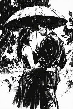 hand_sketch,black and white,art_nlhx,a black and white photograph of a couple standing under an umbrella. The umbrella is open and the couple is facing each other, with the man's head resting on the woman's shoulder. The woman is wearing a sleeveless dress and the man has his arm around her waist. They are both looking into each other's eyes and appear to be in a romantic embrace. The background is blurred, but it appears to be a rainy day. The image is taken from a low angle, so the focus is on the couple and the umbrella.