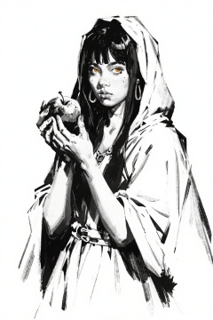 hand_sketch,sketch,black and white,1girl, food, solo, fruit, jewelry, holding food, apple, holding, looking at viewer, holding fruit, black hair, earrings, simple background, hood, bangs, long hair, hood up, dress, cloak, white background, nail polish, orange eyes, hands up, white cloak, yellow eyes