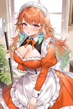 Machi Style,1girl,takanashi kiara,breasts,solo,orange hair,maid headdress,alternate costume,purple eyes,maid,feather earrings,looking at viewer,multicolored hair,long hair,large breasts,cleavage,open mouth,holding,dress,feathers,green hair,enmaided,black and orange dress,earrings,gradient hair,apron,jewelry,blush,bow,puffy sleeves,maid apron,window,long sleeves,frills,back bow,white apron,indoors,frilled dress,juliet sleeves,<lora:Machi_illustriousXL:1>,