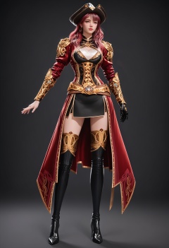 (standing full_body:1.1),score_9,score_8_up,masterpiece,(best quality),intricate details,facing viewer,(looking at viewer:1.1),<lora:YQ_pony_menghongchen_V4:0.8>,q1528437228,solo,1girl,hat,long hair,red hair,boots,thighhighs,blue eyes,gloves,thigh boots,skirt,armor,pink hair,jewelry,belt,brown hair,pirate hat,earrings,coat,high heels,red coat,black gloves,grey eyes,dress,miniskirt,black eyes,black footwear,high heel boots,black headwear,long sleeves,single glove,BREAKscore_9,score_8_up,masterpiece,(best quality),perfect anatomy,(hourglass),perfect face,(simple background,pure black background,black background:1.1),fair_skin,shiny_skin,Ivory_skin,