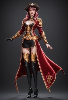 (standing full_body:1.1),score_9,score_8_up,masterpiece,(best quality),intricate details,facing viewer,(looking at viewer:1.1),<lora:YQ_pony_menghongchen_V4:0.8>,q1528437228,solo,1girl,hat,long hair,red hair,boots,thighhighs,blue eyes,gloves,thigh boots,skirt,armor,pink hair,jewelry,belt,brown hair,pirate hat,earrings,coat,high heels,red coat,black gloves,grey eyes,dress,miniskirt,black eyes,black footwear,high heel boots,black headwear,long sleeves,single glove,BREAKscore_9,score_8_up,masterpiece,(best quality),perfect anatomy,(hourglass),perfect face,(simple background,pure black background,black background:1.1),fair_skin,shiny_skin,Ivory_skin,