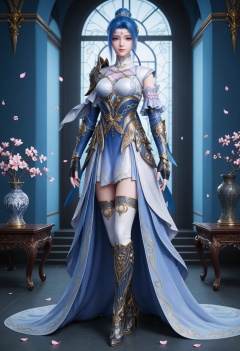 (standing full_body:1.1),(looking at viewer:1.1),masterpiece,(best quality),smog,Dark room,dim lighting,peach blossom,falling petals,<lora:YQ_Illustrious光辉v5_唐舞桐_服装4_V1:0.8>,q1528437228,1girl,solo,blue hair,dress,blue eyes,hair bun,hair ornament,armor,gloves,single hair bun,forehead mark,white dress,fingerless gloves,boots,thighhighs,shoulder armor,high heels,short hair,long hair,blue dress,high heel boots,black gloves,detached sleeves,knee boots,multicolored hair,pauldrons,jewelry,skirt,white thighhighs,