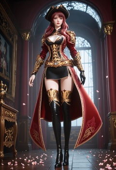 (standing full_body:1.1),(looking at viewer:1.1),masterpiece,(best quality),smog,Dark room,dim lighting,peach blossom,falling petals,<lora:YQ_Illustrious光辉v5_梦红尘_V1:0.8>,q1528437228,solo,1girl,hat,long hair,red hair,boots,thighhighs,blue eyes,gloves,thigh boots,skirt,armor,pink hair,jewelry,belt,brown hair,pirate hat,earrings,coat,high heels,red coat,black gloves,grey eyes,dress,miniskirt,black eyes,black footwear,high heel boots,black headwear,long sleeves,single glove,