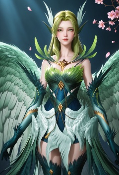 (cowboy shot:1.2),(looking at viewer:1.1),masterpiece,(best quality),smog,Dark room,dim lighting,peach blossom,falling petals,<lora:YQ_Illustrious光辉v5_碧姬_V1:0.8>,q1528437228,solo,1girl,long hair,green hair,feathers,green eyes,blonde hair,hair ornament,pointy ears,wings,gloves,dress,green wings,elbow gloves,jewelry,feathered wings,green dress,thighhighs,armor,yellow eyes,earrings,green feathers,multiple wings,