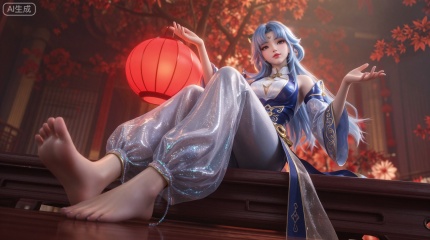 CGI,3D角色设计,低角度仰视构图展示一位拥有浅蓝色长发的动漫风格女性角色,她身着带有精致金边刺绣的蓝白配色丝绸服饰,腿部覆盖着带有珠光质感的半透明薄纱灯笼裤,呈现出极其逼真的布料褶皱与物理下垂感,角色赤脚坐在光泽度极高的深色木质平台上,双腿向前伸展,左手托举着一个内部发光的红色球体灯笼,右手优雅地向外伸展,面部妆容精致,眼神柔和注视前方,背景中充满了红色的枫叶和柔和的暖色调体积光,营造出梦幻的古风氛围,皮肤材质具有细腻的次表面散射(3S)效果,整体画面呈现出高精度的渲染质感,高精度3D模型,PBR写实材质,布料解算,次表面散射皮肤,体积光照明,景深效果,Octane渲染器质感,中国风场景,4K高清纹理,电影级布光,