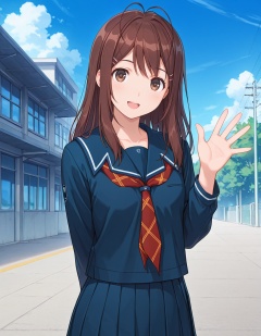 masterpiece, best quality, amazing quality, detailed background,1girl, outdoors, blue sky, solo, school, looking at viewer, waving, smile, open mouth, <lora:yuumi_hoshino-kimikiss_pure_rouge_s1-ixl-anime-soralz:1>, yuumi hoshino (kimikiss pure rouge), long hair, antenna hair, hairclip, sidelocks, brown eyes, brown hair,school uniform, blue serafuku, blue sailor collar, orange neckerchief, plaid neckerchief, long sleeves, blue pleated skirt