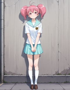 masterpiece, best quality, amazing quality, outdoors, wall, school,1girl, looking at viewer, solo, head tilt, blush, v arms, standing, full body,<lora:megumi_minami-tantei_gakuen_q_s1-v2-ixl-anime-soralz:1>, megumi minami (tantei gakuen q), short hair, twintails, antenna hair, pink hair, hair between eyes, pink eyes,school uniform, white serafuku, aqua sailor collar, short sleeves, aqua pleated skirt, white kneehighs, brown loafers, <lora:StS-Illustrious-Detail-Slider-v1.0:3>