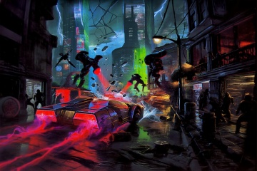 a6blp. A vibrant cyberpunk dystopian cityscape, pulsating with neon reds, electric blues, and sickly greens, clashes against the oppressive darkness of a sprawling urban jungle. Towering skyscrapers loom overhead, their glass facades glowing with glitching holograms and flickering signs. At street level, chaos erupts: a high-speed chase barrels through rain-soaked alleys, illuminated by the erratic glow of broken streetlights and hovering drones. The angular, armored vehicle in the foreground skids around a street, its glossy surface reflecting bursts of neon light. Its rear leaves streaks of red and violet energy in its wake, creating a haunting contrast against the shadows. Behind, ominous enforcement units hover--sleek, black machines emitting piercing red searchlights, their mechanical hums pulsing like a heartbeat of dread. Shattered glass and debris float mid-air in surreal slow motion as the chase cuts through the tense, rain-drenched streets. Shadowy figures lurk in the periphery, their distorted silhouettes barely visible in the dim alleyways and balconies, evoking unease. The sky above fractures with streaks of lightning, casting fragmented shadows across the city. The atmosphere is thick with tension, the hum of power lines, and the distant wail of distorted sirens. A story of desperation and relentless pursuit unfolds in a neon-soaked nightmare of confrontation and defiance.best quality,color contrast,cinematic,highres,glow,sharp focus,clear,long exposure,