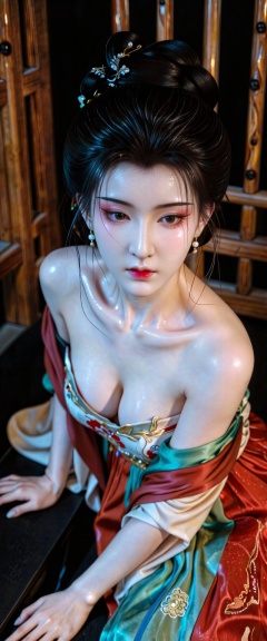 photography masterpiece,CanonEOSR5,RF85mm F1.2 L USM, best quality,guofeng,Ancient Chinese beauty,beautiful girl,solo,pitifully delicate,Tsundere,exquisite beautiful face,beautiful eyes,(whiten the skin),skin details(Porcelain like smooth, flawless and translucent skin),exquisite hairstyle,exotic makeup,eyeliner,rosy lips,huge breasts,hanfu,strapless,low-cut,silks and satins,visually pleasing,traditional Chinese imagery,masterful framing,aesthetic,dynamic angle,dramatic perspective, perfect composition,elegant and natural movements,ambient light,supplementary lighting, Fine Details,perfect shooting angle,Indoor environment, wooden structure,