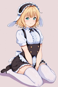 alp Style,1girl,solo,blonde hair,thighhighs,kirima syaro,frills,frilled hairband,fleur de lapin uniform,animal ears,fake animal ears,underbust,white thighhighs,short sleeves,skirt,shirt,miniskirt,sitting,hairband,white background,black hairband,white shirt,black skirt,rabbit ears,center frills,looking at viewer,puffy sleeves,puffy short sleeves,short hair,simple background,frilled shirt,lolita hairband,apron,hand between legs,wariza,full body,waist apron,between legs,closed mouth,white apron,frilled apron,black footwear,smile,shoes,green eyes,zettai ryouiki,shadow,aqua eyes,frilled skirt,maid headdress,collared shirt,<lora:alp_illustriousXL:1.2>,