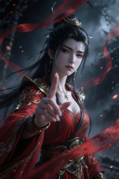 为中式怪诞风格。美丽而优雅神圣的不知火舞,红衣,慈悲中又有点邪性的,单手向着镜头勾勾手指,诱惑,仿佛伸出画面。脸部白皙皮肤光滑水嫩细腻,高雅的质感,斜眼看镜头,腼腆。飘渺神秘,红色丝带镜头前虚化借景,画笔厚涂,低饱和度,笔触纹理清晰,画面通过细腻的笔触和丰富的色彩层次塑造主体与场景,质感逼真,法天象地,表情高冷,服装华丽,复杂,奢华,唯美,充满压迫感,整体兼具艺术感,大透视,底光打在脸上,镜头仰视主体,悲天悯人,高高在上,圣洁高傲,清冷淡漠如梦如幻,氛围感。超广角强透视构图,张力十足,压迫感,细节生动完美。极其震撼的一幕,视觉冲击力强,光影彼此交织错杂的梦幻感,朦胧,明暗对比强烈,阴影过渡自然,电影级构图,视觉冲击,8K画质,超清,极致细节,清晰的线条,高对比,大师级别的作品。立体渲染,精细画笔,超细腻笔触,线条流畅,超清画质,完美品质,高质量,自适应饱和度,专业级打光,大师杰作,自由视角,阴影过渡自然,氛围感,高级感,意境,亮闪,唯美,宿命感拉满,弥散粒子,画面具有层次感。视觉冲击大,故事感,高级感,动态感。震撼,大师构图震撼人心。游戏感,强烈透视,震撼视觉,ue5渲染,命运史诗感,黑色风格,诺兰电影色调,浓雾,弥散,唯美辉光