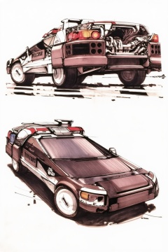 Two conceptual sketches of a low-slung, futuristic police vehicle are displayed on a white surface. The top illustration presents the vehicle from a rear-quarter low angle, showcasing a dense array of exposed mechanical parts, tubes, and multiple round taillights set into dark rectangular blocks. Below this, a second sketch depicts the same vehicle from a front-quarter perspective, emphasizing its sharp, wedge-shaped nose and a wide, steeply slanted windshield. The vehicle's exterior combines white, red, and dark brown panels, with the front wheels featuring solid white disc covers. The car design incorporates several technical-looking modules on its roof and side panels, maintaining a sleek yet industrially complex appearance.