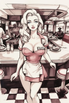 Silmas. A waitress named Chastity, with her name embroidered on a tag beside her ample bosom, standing behind the formica counter of a sun-drenched, classic American diner. She has voluminous platinum blonde bombshell curls, and large baby-blue eyes. Her tight, 1950s-style pink and white uniform is showing her cleavage. A black-and-white checkered floor, and glass domes covering pies on the counter. In the deep background, a cook works at a griddle and a town sheriff sits in a booth, both rendered with soft focus