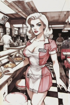 Silmas. A waitress named Chastity, with her name embroidered on a tag beside her ample bosom, standing behind the formica counter of a sun-drenched, classic American diner. She has voluminous platinum blonde bombshell curls, and large baby-blue eyes. Her tight, 1950s-style pink and white uniform is showing her cleavage. A black-and-white checkered floor, and glass domes covering pies on the counter. In the deep background, a cook works at a griddle and a town sheriff sits in a booth, both rendered with soft focus