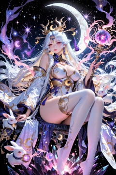 masterpiece, best quality, 1girl, Chang'e, moon goddess, sitting on crystal crescent moon, long light blue and white hair, golden hair accessories, red eyes, white and purple robe with gold trim, sheer white thighhighs, floating ribbons, small white rabbit, glowing starry orb, magical mist, sparkles, star particles, dark fantasy palace background, cinematic lighting, detailed shading, vibrant colors, anime illustration, digital painting