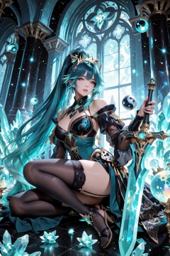 masterpiece, best quality, 1girl, female warrior, long gradient black and white hair, teal hair tips, high ponytail, teal and gold hair ornament, dark teal bustier, sheer white off-shoulder sleeves, black thigh-high stockings, garter straps, black high-heeled sandals, holding a large futuristic sword, glowing teal crystals, yin-yang emblem on sword, small pink magical cat, golden headpiece with blue gem, floating starry crystal orb, dark fantasy palace interior, tall columns, grid windows, cinematic lighting, sparkles, star particles, anime illustration, digital painting