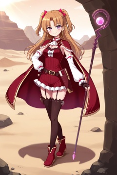 lauraabsno, 1girl, solo, brown hair, long hair, two side up, parted bangs, hair bow, pink bow, pink eyes, medium breasts, choker, ascot, red cape, detached sleeves, black gloves, fingerless gloves, red dress, ribbed dress, belt, book holster, garter straps, black thighhighs, ankle boots, red footwear, outdoors, desert, holding staff, smug, smile, standing, full body,