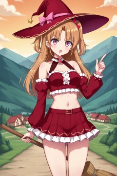 lauraabsno, 1girl, solo, brown hair, long hair, two side up, parted bangs, hair bow, pink bow, pink eyes, medium breasts, red hat, witch hat,  red shirt, crop top, long sleeves, puffy sleeves, bare shoulders, collarbone, navel, red skirt, broom, holding broom, hand up, index finger raised, open mouth, :o, v-shaped eyebrows, outdoors, village, cowboy shot, looking at viewer,