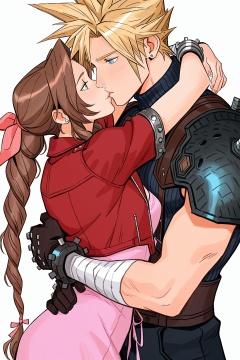 ami thompson Style,1girl,cloud strife,aerith gainsborough,1boy,blonde hair,braid,spiked hair,red jacket,shoulder armor,gloves,brown hair,braided ponytail,upper body,armor,bandages,ribbon,jewelry,bandaged arm,hair ribbon,hetero,blue eyes,white background,long hair,earrings,turtleneck,jacket,sleeveless turtleneck,sidelocks,bracelet,short hair,parted bangs,hug,sleeveless,couple,kiss,black gloves,cropped jacket,blue shirt,short sleeves,single earring,pink dress,suspenders,shirt,dress,<lora:ami thompson_illustriousXL:1>,