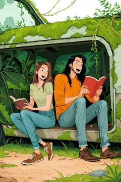 ami thompson Style,sitting,facial hair,1girl,pants,black hair,book,denim,motor vehicle,1girl,grass,overgrown,moss,holding,shirt,jeans,1boy,shoes,brown footwear,long hair,reading,brown hair,plant,open mouth,smile,holding book,vines,<lora:ami thompson_illustriousXL:1>,