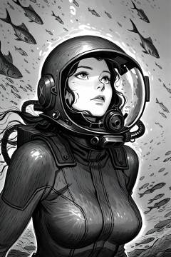 ami thompson Style Type-II,1girl,monochrome,greyscale,solo,breasts,lips,long hair,upper body,diving helmet,looking up,traditional media,underwater,fish,<lora:ami thompson_illustriousXL:1>,