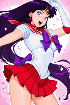 ami thompson Style,1girl,sailor mars,sailor senshi uniform,solo,hino rei,long hair,magical girl,gloves,skirt,jewelry,red skirt,red sailor collar,earrings,white gloves,purple eyes,traditional media,bow,elbow gloves,tiara,sailor collar,purple hair,heart,bare legs,purple bow,pleated skirt,open mouth,star \(symbol\),very long hair,brooch,choker,upper body,teeth,<lora:ami thompson_illustriousXL:1.2>,