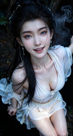 美颜,16岁少女皮肤,去AI 感,极具视觉冲击力精致壁纸风,皮肤雪白细腻水润如瓷,无AI 合成痕迹,,职业微笑温柔勾人,眼神妖艳妩媚直视镜头,完美身材(纤细四肢+ 紧致腰线),倾斜构图、远景、超广角、自拍照、景深、空间感、层次感,自拍视角, 古风美人,气质空濛,电影氛围感,情绪氛围感,线条清晰,明暗对比,超高清,高级感,最高画质,第一视角怼腹部仰视角度拍摄,摩卡少女樱真人拍摄,长发及腰、超长耳坠、碎发、多条细长飞舞发带、宽松白纱衣露出,如楚辞山鬼般的人物,在昏暗森林里的全身人像写真,丰富细节,含情眼,邪魅,魅惑,朦胧感,丰富的细节,眼神充满故事感,嘴巴微微张开。淡淡的喜悦,发丝凌乱,精致细长耳坠,高质量,写实逼真,光滑水润细腻冷白皮肤肌理,3D高精度建模渲染,立体唇纹反光,细腻皮肤纹理柔和8K超清真人比例建模,电影级景深,动态表情捕捉,瞳孔虹膜分层着色。高饱和全彩。妙龄绝美。完美锁骨,冷白光照在脸上。电影级构图。王家卫电影风格。风吹起衣裳飘逸。素衣清颜。没有头饰,临水照影眸含烟,似随时化雾归去。斑驳树影,真人模仿,超高清,超细腻的画面细节,真实的皮肤纹理,究极细节,白皙柔嫩的皮肤,光滑细腻的皮肤,扬的头发,细节丰富的发丝,宁静优雅,布满水珠的皮肤,氛围感,32K,超逼真的皮肤纹理,超级详细,高度细节,注重细节,明脂对比,究极细节,大师级光影,层次感,立体感,极致的光线,发细腻,发丝细腻,眼眸俏皮地眨动,姿态灵动,动作自然、角色扮演、微距镜头、眼部特写、臉部特寫,全脸镜头、眼神看向镜头。,aurora_glossy_pantyhose