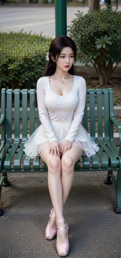 The image shows a person sitting on a green, metal bench outdoors. The person is wearing a white, long-sleeved top and a white, tulle skirt, and is dressed in pink ballet shoes. The person is sitting with their legs crossed and hands resting on their knees, looking slightly to the side. The background includes green bushes and trees, and the ground is paved with asphalt. There is also a green pole behind the person. The image has a soft, natural lighting, and the overall setting appears to be a park or garden area.