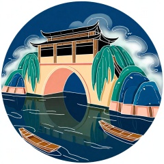 XSDB, A compact circular vignette features a classic covered bridge arching over a reflective river, surrounded by simplified willow branches and misty banks. Rendered with crisp linework in soft indigo, warm sand, and light peach tones, bold black outlines define wooden beams and foliage. Flat color fields with subtle gradients suggest space, while textured brushstrokes appear in water reflections and cloud edges. Two tiny boats float gently below, enhancing poetic tranquility, merging classical Jiangnan scenery with contemporary illustrative simplicity.