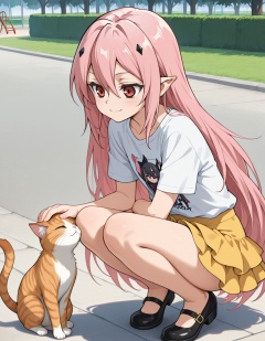 masterpiece, best quality, amazing quality, gradient background,1girl, solo, white t-shirt, yellow skirt, layered skirt, crouching, petting, cat, street, sidewalk, day, smile, happy, print shirt, park, grass, playground, mary janes, <lora:krul_tepes-owari_no_seraph_s2-ixl-anime-soralz:1>, krul tepes (owari no seraph), long hair, pink hair, hair between eyes, sidelocks, red eyes, pointy ears, hair down, <lora:StS-Illustrious-Detail-Slider-v1.0:3>