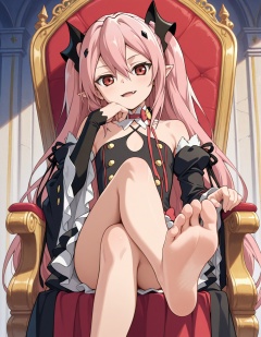 masterpiece, best quality, amazing quality,1girl, indoors, throne, crossed legs, light smile, hand under own chin, solo, looking at viewer, sitting, open mouth, fang, <lora:krul_tepes-owari_no_seraph_s2-ixl-anime-soralz:1>, krul tepes (owari no seraph), long hair, pink hair, two side up, hair between eyes, sidelocks, red eyes, pointy ears, hair ornament, vampire, choker, red bow, ribbon, criss-cross halter, black dress, frilled dress, detached sleeves, arm warmers, wide sleeves, foot focus, unworn boots