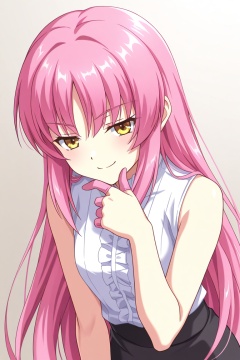 f1g3rc0ts, finger cots, pink finger cots, 1girl, solo, rinreionyouilus, pink hair, very long hair, hair down, sidelocks, yellow eyes, white shirt, sleeveless, black skirt, pencil skirt, upper body, stroking own chin, smug, smile,