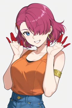 f1g3rc0ts, finger cots, red finger cots, 1girl, solo, reginapf, dark pink hair, short hair, hair over one eye, hairclip, lipstick, blue eyes, hoop earrings, orange **** top, sleeveless, yellow armlet, denim pants, upper body, hands up, smile, teeth,