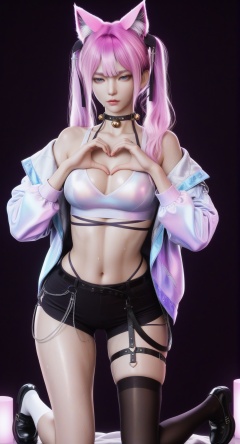 masterpiece,best quality,absurdres,highres,front view,looking at viewer,shaded_face,jitome,heart hands,collarbone,(glamor:1.1),narrow waist,<lora:XiaoFen_ill-000008:0.85>,1girl,solo,xiaofen,pink hair,long hair,twintails,blue eyes,hair ornament,animal ear fluff,black choker,bell choker,crop top,cross hair ornament,white crop top,iridescent jacket,open jacket,short shorts,black short shorts,thighs,thigh strap,belt,(asymmetrical_legwear),black thighhigh,white sock,loafers,black loafers,kneeling,(slender_waist:1.2),(glamor:1.2),navel,groin,(mound_of_venus),toned body,toned midriff,(white_skin),(sweaty skin),(very sweaty),(pale_skin),(fair_skin),shiny wet,warm soft,high detail,soft pastel lighting,aesthetically pleasing,simple background,black background,