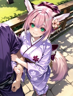 <lora:hanazuki_IL_v1.0:1>,hanazuki,purple yukata,smile,(shirokitsune:0.8),standing,hair up,outdoors,hugging another's arm,from above,, masterpiece,best quality,