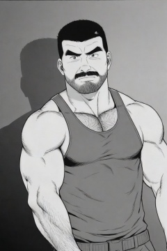 tgywl, a shirtless man with a thick beard and black hair slicked back. A man wearing a thongs, a military Asian cut, a sports vest, and swimsuits,