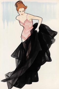 A woman with red-orange hair styled in an intricate updo is depicted bending forward and looking down with a focused expression. She wears a light pink slip or chemise, which features visible lace trim along the bust and hem. Her right arm extends downward, holding up a voluminous black skirt composed of layered, sheer, and opaque fabrics, which pools at the bottom. Her body is angled slightly to the left. The background is plain and light, marked by faint, light blue vertical streaks. The scene is viewed from a slightly elevated camera angle.