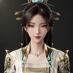 black hair,long hair,brown eyes,hair_ornament,hair_bun,necklace,raoxi white and gold dress,long_sleeves,1girl,solo,jewelry,
