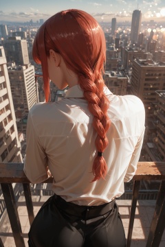 masterpiece, best quality, amazing quality, hyper-Detailed Realistic, makima \(chainsaw man\), from behind, against railing, depth of field, hyper-detailed background, cityscape, bokeh,amazing quality,dappled sunlight, shadow, cinematic, natural lighting,