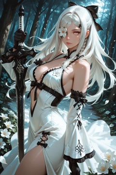 masterpiece, best quality, newest, absurdres, highres, dynamic angle, cinematic lighting, volumetric lighting, zero \(drag-on dragoon\), alternate costume, 1girl, solo, long hair, looking at viewer, dress, bow, medium breasts, center_opening, braid, flower, white hair, black hair bow, detached sleeves, black gloves, white dress, petals, holding sword, white flower, nature, flower over eye, embroidery, black trim, from_side, flower trim, from side,