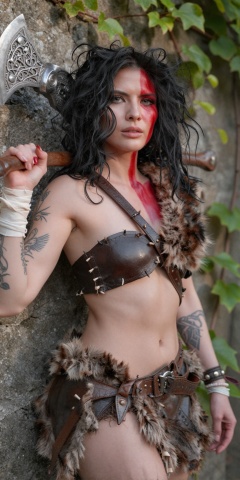 An ultra-realistic, high-definition 8k photograph of a stunning female warrior with voluminous, messy raven hair and piercing light-colored eyes. She is captured in a pensive and authoritative pose, leaning against a weathered stone wall with green climbing ivy. She wears a bold, crimson-red stripe of war paint running vertically over her left eye and across her chest. Her outfit is a minimalist, primitive ensemble of hand-stitched dark leather and brown fur, including a one-shoulder crop top and a low-slung tattered belt that accentuates her sculpted, athletic midriff. She carries a massive, intricately etched silver battle-axe with a gnarled wooden handle resting across her shoulders. Her arms are decorated with delicate black-ink tattoos and a white linen bandage wrap on her wrist. The lighting is soft and natural, emphasizing the high-contrast red paint against her pale, flawless skin and the metallic sheen of the axe. Shot with a 50mm lens, cinematic quality, and masterpiece rendering. However, the elven woman has a bright, colorful, pastel-colored theme, with her hair and eyes reflecting a softer, more ethereal vibe, and her attire blending seamlessly into a harmonious blend of pastel shades and intricate details.