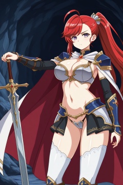 rubyfranthorp, 1girl, solo, red hair, long hair, ponytail, ahoge, swept bangs, asymmetrical bangs, hair ornament, light purple eyes, large breasts, red cape, white cape, two-sided cape, red brooch, jewelry, blue pauldrons, vambraces, grey bikini armor, navel, black showgirl skirt, grey faulds, blue crotch plate, black panties, white thighhighs, brown knee boots, cowboy shot, sword, holding sword, serious, standing, looking at viewer, cave interior,
