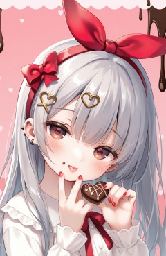masterpiece,absurdres,best quality,petite,high quality,chromatic_aberration,loli,//,1girl,solo,long hair,looking at viewer,blush,bangs,hair ornament,long sleeves,bow,ribbon,holding,brown eyes,jewelry,closed mouth,upper body,hair bow,grey hair,heart,hairband,food,tongue,tongue out,nail polish,red bow,red ribbon,head tilt,symbol-shaped pupils,hands up,eating,piercing,holding food,x hair ornament,ear piercing,candy,red nails,chocolate,valentine,heart hair ornament,red hairband,food on face,