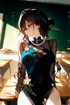 depth of field,(artist:quasarcake:0.8),extreme aesthetic,(wlop:0.6),wanke,relle,wanke,masterpiece,best quality,good quality,newest,year 2024,year 2023,very aesthetic,absurdres,A shot with tension,ultra-high resolution,32K UHD,sharp focus,best quality,masterpiece, (Ruan Mei_(/Honkai: Star Rail/) , dress, jewelry, black_hair, long_hair, black_dress, earrings, classroom, chalkboard, bracelet, hair_ornament, covered_navel, indoors, desk, teacher, bangs, see-through, hair_between_eyes, necklace, blush, solo_focus, green_eyes, curvy, belt, flower, sitting, wide_hips, school_desk, long_sleeves,,,,,