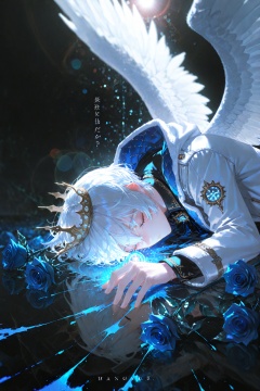 HX guangying,depth of field,lens flare,(visual impact:1.4),masterpiece,absurd,32k ultra high definition,sharp focus,(artist: quasarcake:0.8),(wlop:0.6),Vanke,Laila,vibrant color splashes,movie,solo, long sleeves, 1boy, jacket, closed eyes, flower, white hair, male focus, wings, english text, rose, crown, feathered wings, blue flower, blue rose, sample watermark, bishounen