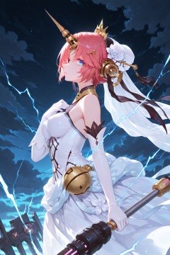 1girl, solo, frankenstein's monster \(fate\), single horn, horns, dress, gloves, blue eyes, mechanical horns, white gloves, short hair, white dress, veil, weapon, elbow gloves, sky, flower, bare shoulders, cloud, holding, hand on own chest, profile, breasts, from side, headgear, hair ornament, holding weapon, looking at viewer, night, cloudy sky, hair flower, electricity, detached sleeves, standing, xxhanfu halo cyber phoenix crown, (\shuang hua\)