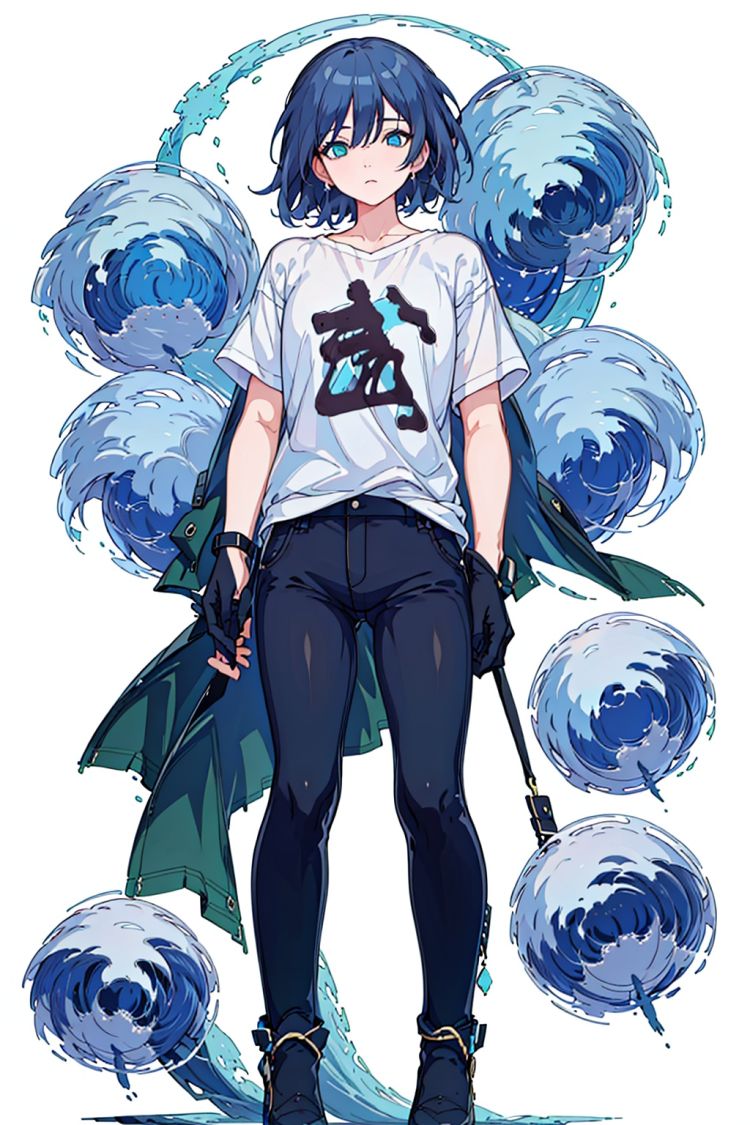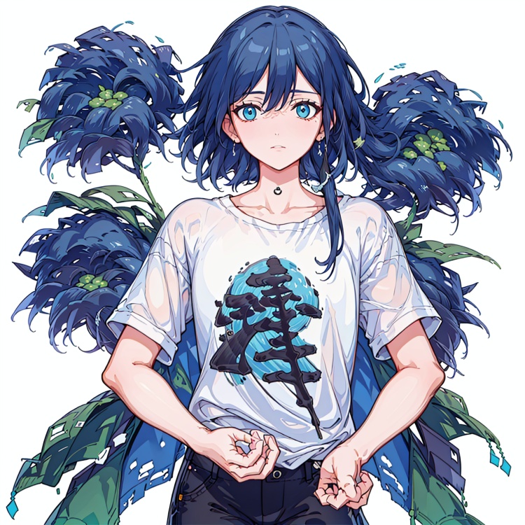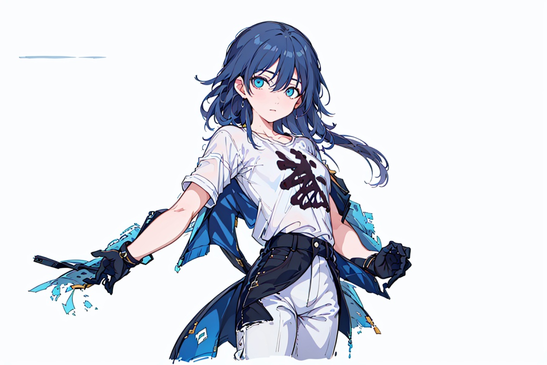t-shirt,blue_eyes,hair_between_eyes,fu hua,white_shirt,(black pants),black legwear,fu hua,logo on t-shirt,logo on shirt,pattern on t-shirt,pattern on shirt,hair between eyes,