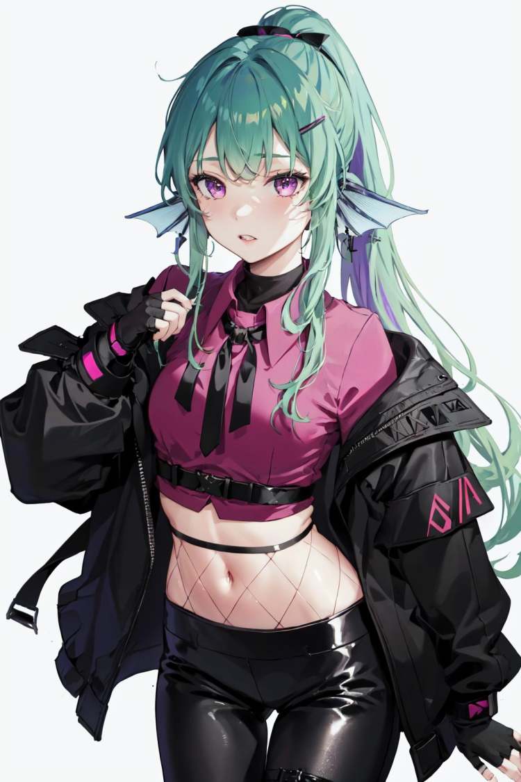 finana3st, purple shirt, hairclip, black gloves, fingerless gloves, black jacket, midriff, black pants, fishnets, earrings